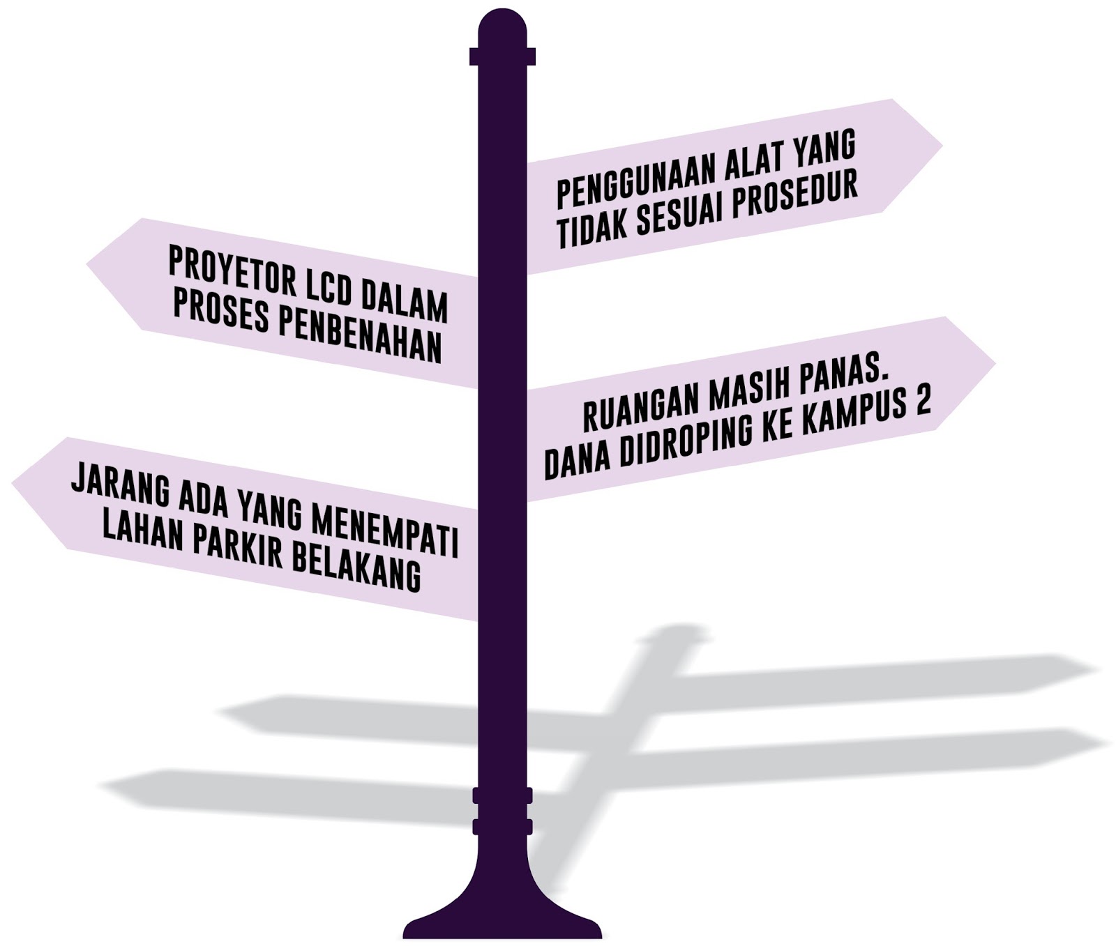 “Menurut saya masih banyak sekali fasilitas kampus yang kurang, terutama dalam proses pembelajaran,” ungkap mahasiswa Prodi Teknik Multimedia Jaringan 2014, Danar Suhendra (24/09/16). Keluhan yang umum seperti proyektor LCD yang rusak, adanya kelas yang bertabrakan dalam penggunaan ruangan Gedung Sekolah juga dirasanya cukup menggangu proses pembelajaran.