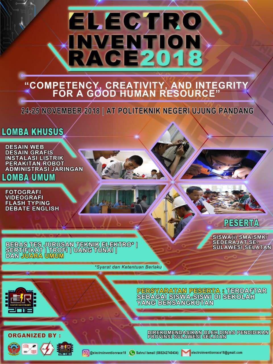 Himpunan Mahasiswa Elektro (HME) Politeknik Negeri Ujung Pandang (PNUP) kembali menyiapkan ajang kompetisi Electro Invention Race (EIR) 2018. EIR tahun ini bertema “Competency, Creativity, and Integrity For A Good Human Resource”.