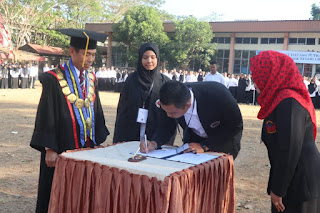| Pengesahan. Pengesahan secara simbolis mahasiswa baru angkatan 2019 dengan penandatanganan dan pemakaian almamater, Kamis (22/08). [ZKY/297] |