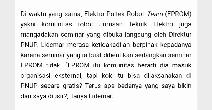 Adapun penggalan pernyataan WD 3 yang dimaksud pada berita sebelumnya, yaitu “EPROM itu komunitas berarti dia masuk organisasi eksternal, tapi kok itu bisa dilaksanakan di PNUP secara gratis? Terus apa bedanya yang saya bikin dan saya diusir?” tanya Lidemar.