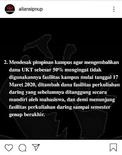 Hingga mahasiswa menuntut kepada birokrasi untuk meringankan biaya Uang Kuliah Tunggal (UKT) yang akan mereka bayar. Seperti yang tertera pada instagram @aliansipnup