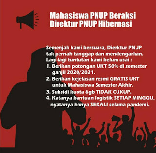 Maka dari itu, Aliansi PNUP melalui poin pertama menuntut pimpinan kampus untuk memotong UKT sebesar 50% di semester ganjil 2020/2021. Berdasarkan pernyataan sikap Aliansi PNUP, tuntutan tersebut dituntut kembali mengingat penghematan biaya operasional PNUP yang tidak terpakai selama masa pandemi dan penghematan biaya cetak buku SPT 2019 yang tidak direalisasikan, sehingga diharapkan bahwa hal tersebut dapat menutupi kekurangan nominal UKT di semester ganjil 2020/2021.