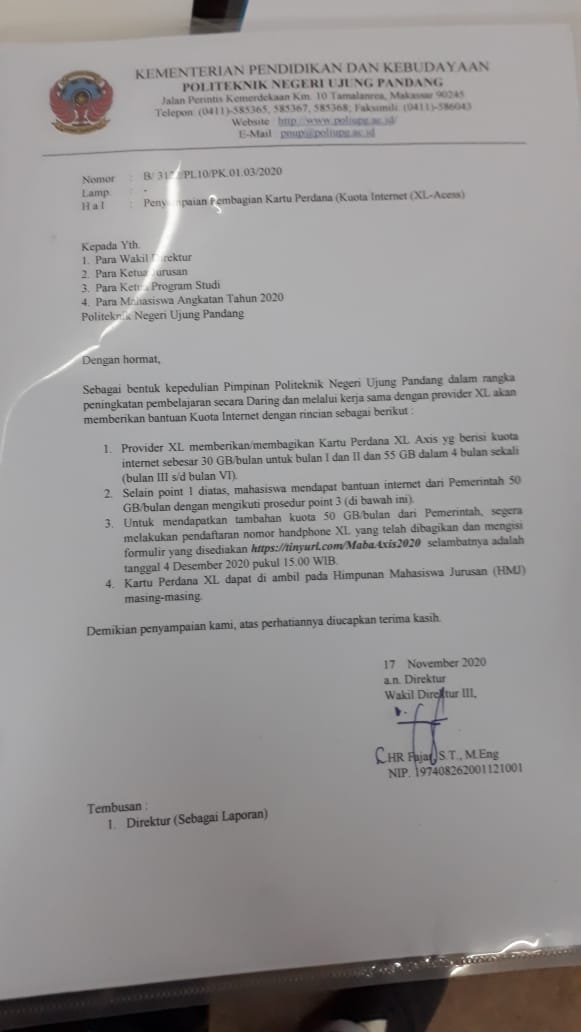 METANOIAC.id Sejak beredarnya surat edaran dari Direktur Politeknik Negeri Ujung Pandang (PNUP) yang ditandatangani oleh Wakil Direktur (WD) III HR. Fajar, mengenai penyampaian kartu perdana provider XL-Axis resmi diluncurkan sebanyak 2000 buah. Kartu tersebut merupakan kartu internet dengan kuota sebesar 30 Gigabyte (GB) untuk satu bulan. Jika kartu itu diaktifkan maka secara otomatis kuota sejumlah 30 GB akan masuk. Bulan berikutnya juga 30 GB, lalu bulan ketiga dan bulan keenam sejumlah 55 GB.