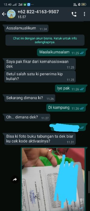 “Silakan ke mesin ATM dek, biar kembali normal rekening penerima KIP ta. Bisa di percepat dek karena jangan sampai kode aktivasinya kadaluwarsa,” kata si pelaku dalam chat via Whatsapp, Kamis (8/5).