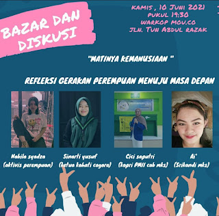 Dalam bazar diskusi yang dilaksanakan oleh Serikat Perempuan Indonesia (SRIKANDI) Kota Makassar, Kamis Malam (10/06) di Warkop Mau.co Jalan Tun Abdul Razak, Gowa dengan tema “Matinya Kemanusiaan” masih banyak yang menganggap bahwa isu-isu perempuan adalah masalah perempuan bukan masalah kemanusiaan. Diskusi ini dihadiri oleh berbagai elemen masyarakat yang terlibat secara sadar dalam memperjuangkan hak-hak perempuan yang juga termasuk masalah kemanusiaan.