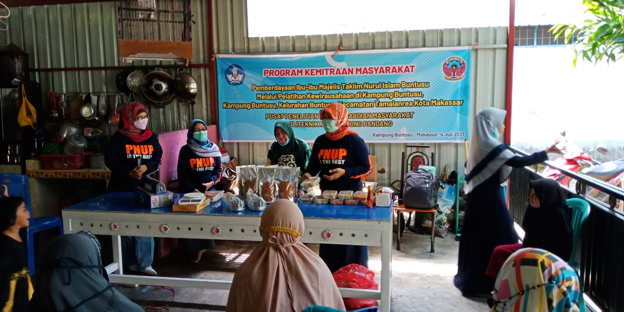 METANOIAC.Id Politeknik Negeri Ujung Pandang (PNUP) melalui kegiatan Program Kemitraan Masyarakat (PKM) mengadakan kegiatan pelatihan kewirausahaan di Kampung Buntusu, Kelurahan Buntusu, Kecamatan Tamalanrea, Kota Makassar untuk meningkatkan pemberdayaan Majelis Taklim Nurul Islam Buntusu. Kegiatan ini mendapat dukungan dana dari PNUP dan dilaksanakan di Kampung Buntusu pada tanggal 4 Juli 2021 oleh tim dosen yang diketuai oleh Nur Alam La Nafie dengan anggota Yayu Meiniza Zainiar, H. Muh. Tang, dan Tjare A. Tjambolang, selaku dosen jurusan Administrasi Niaga PNUP dan beberapa mahasiswa, yakni Briora Tasik Langi’ Kalua’ dan Iffah Afifah Za.